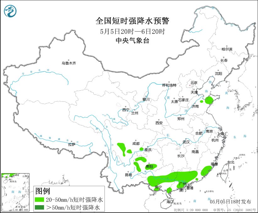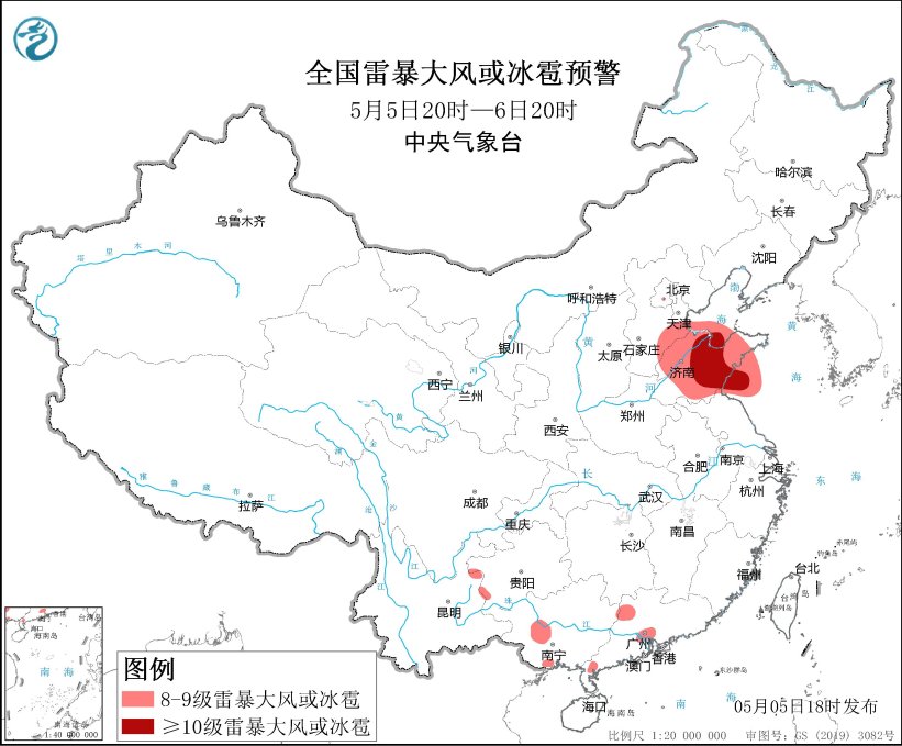 预计5月5日20时至6日20时,华北地区东南部、西南地区东南部、华南西部和南部等地的部分地区将有8级以上雷暴大风或冰雹天气,其中,山东中东部等地的部分地区将有10级以上雷暴大风;华南地区中部、西南地区东南部等地的部分地区将有小时雨量大于20毫米的短时强降水天气,其中,华南中部最大小时雨量可达50毫米以上。